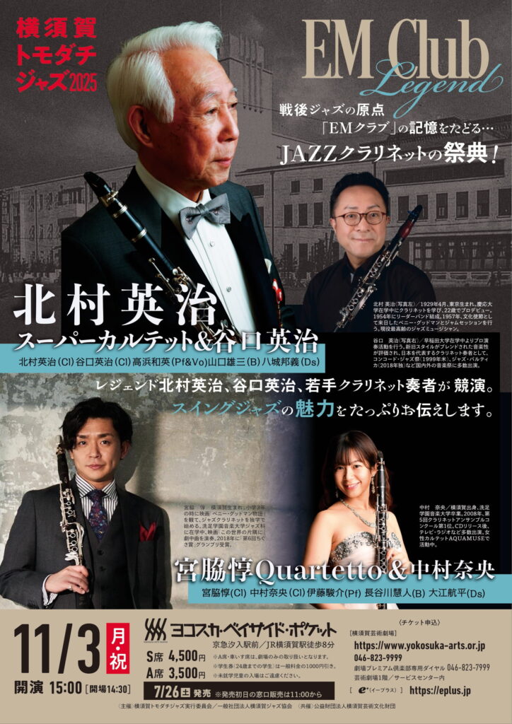戦後ジャズの原点「EMクラブ」の記憶をたどる…。JAZZクラリネットの祭典!レジェンド北村英治、谷口英治、若手の宮脇惇らが競演。スイングジャズの魅力をたっぷりお伝えします。